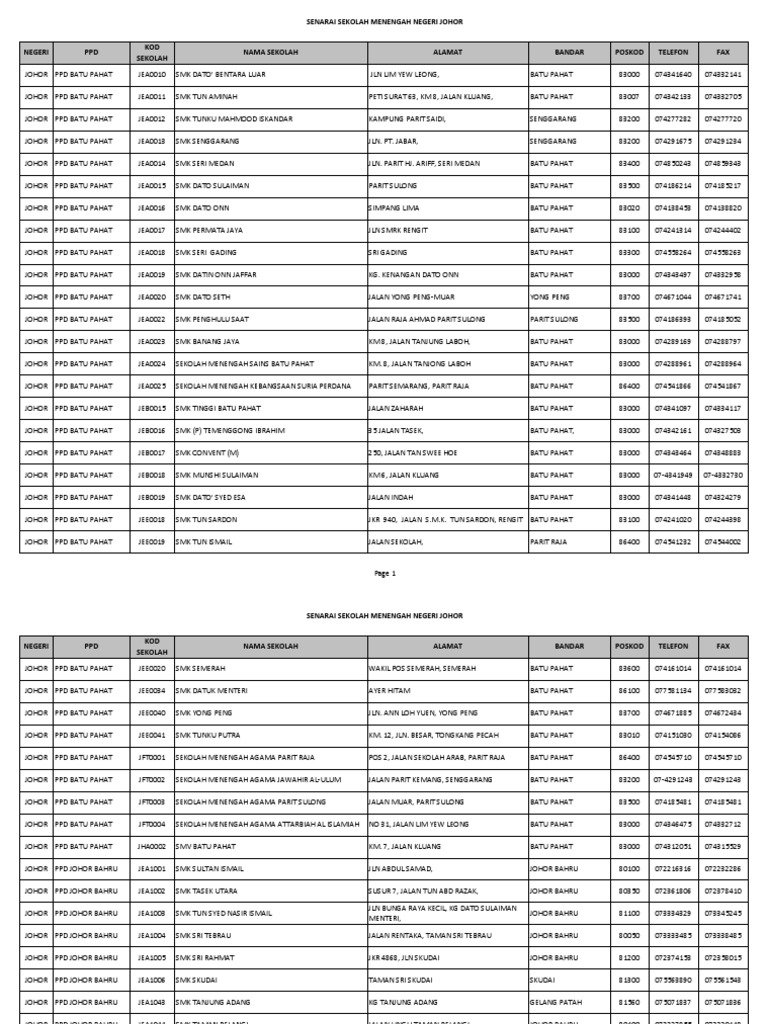 Senarai Sekolah Menengah Di Negeri Johor Sekolah Menengah Di Negeri Johor Darul Takzim Bil Kod Kahang